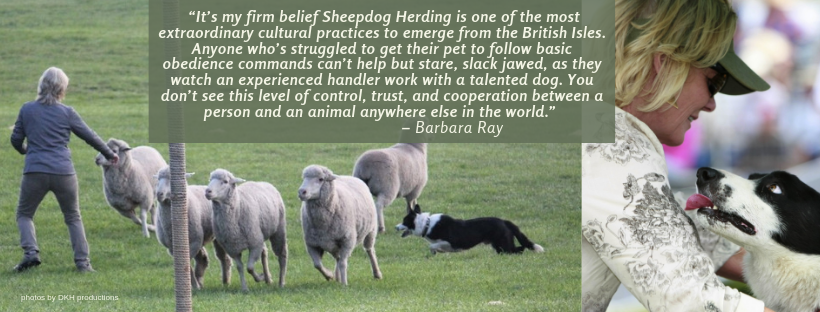 to the general public about the sport, Barbara answers, “Every culture in the world tends to develop one or two truly unique ways to solve a problem. These methods stand out because they take on their own life and evolve beyond simply “getting a job” and become their own distinctive art form. It’s my firm belief Sheepdog Herding is one of the most extraordinary cultural practices to emerge from the British Isles. Anyone who’s struggled to get their pet to follow basic obedience commands can’t help but stare, slack jawed, as they watch an experienced handler work with a talented dog. You don’t see this level of control, trust, and cooperation between a person and an animal anywhere else in the world. While technology often makes traditional stuff like this obsolete, I’d challenge anyone to name a more efficient and elegant way to work livestock on a working farm today. Sheepdog Herding is one of the few cultural practices of its kind that not only survives but continues to thrive in the 21st century. As a handler with a passion for the sport, thinking about that brings a big smile to my face!”