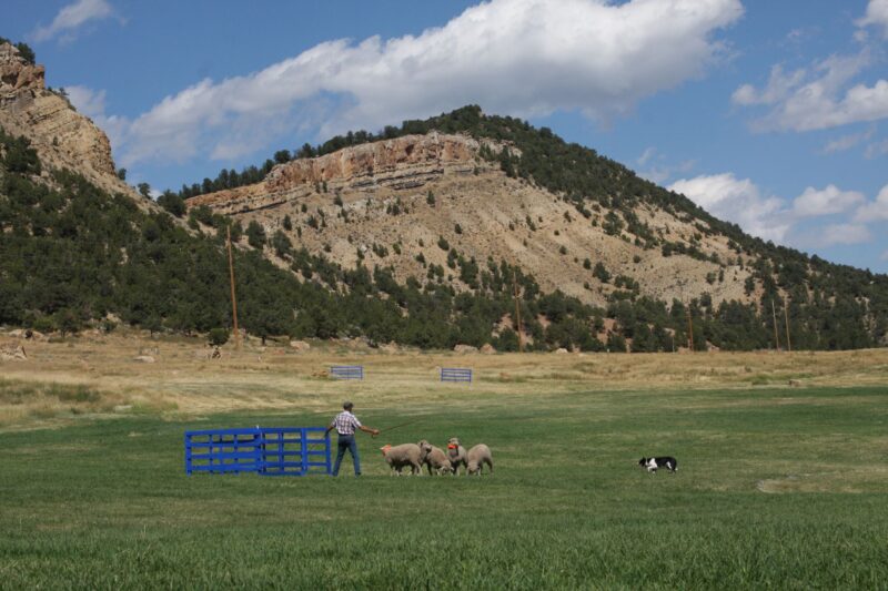 The trials are situated at Ute Park. A park that borders the western city limits of Meeker, Colorado. Approximately 115 acres and includes a natural open native space venue, that also serves as a trailhead to BLM property at the north end. During the spring, the south facing slopes, cedars and brush provide good habitat for a local rancher’s cows. The rest of the year people can walk or bike the trails and enjoy the open spaces with their dogs. The irrigated meadow on the south side provides a good crop of hay. The park is used by the Meeker Classic for a week each year for our annual sheepdog trials.
