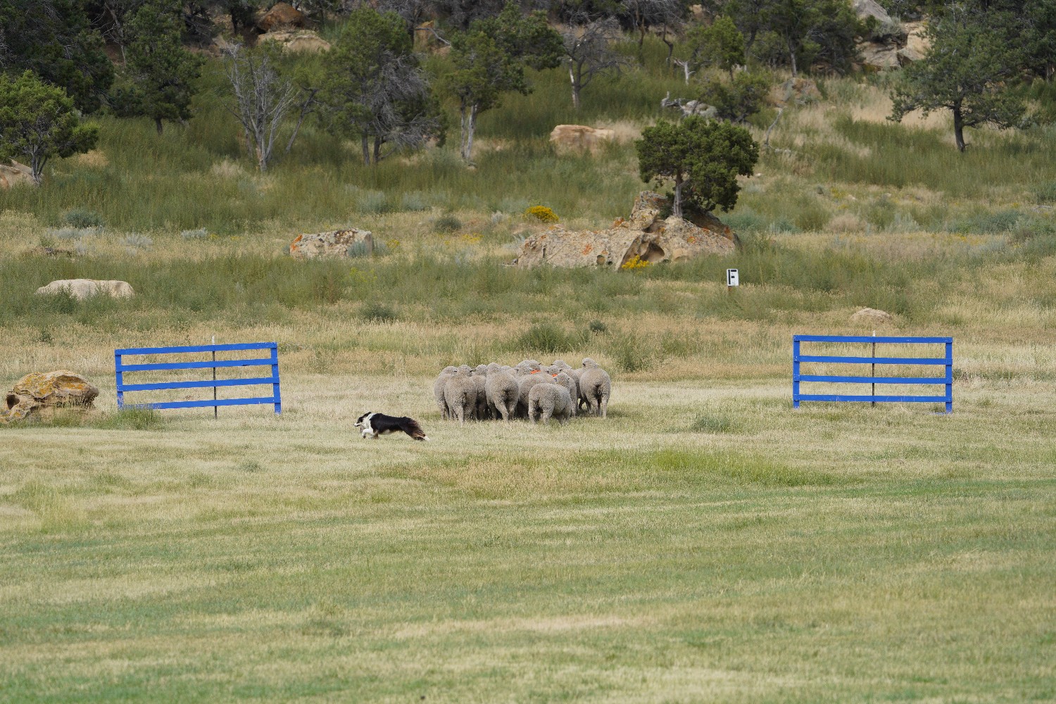 The trials are situated at Ute Park. A park that borders the western city limits of Meeker, Colorado. Approximately 115 acres and includes a natural open native space venue, that also serves as a trailhead to BLM property at the north end. During the spring, the south facing slopes, cedars and brush provide good habitat for a local rancher’s cows. The rest of the year people can walk or bike the trails and enjoy the open spaces with their dogs. The irrigated meadow on the south side provides a good crop of hay. The park is used by the Meeker Classic for a week each year for our annual sheepdog trials.