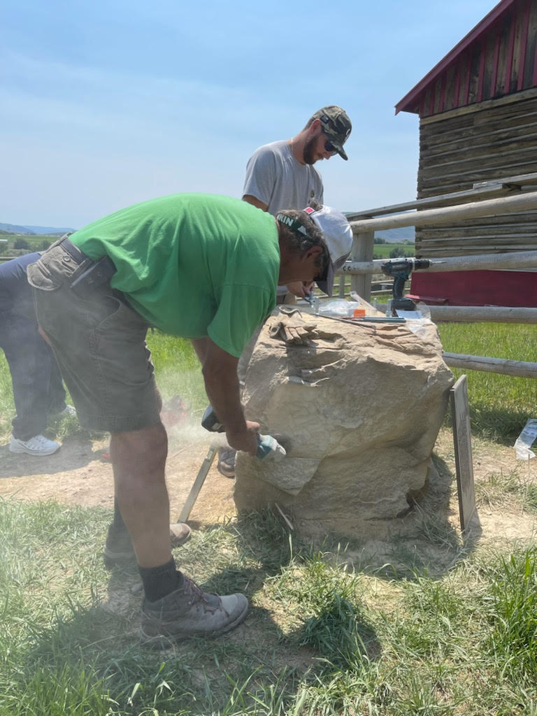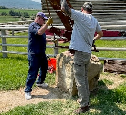 Meeker Classic Chairman, Regas Halandras and Tyler Penley ready the native boulder for the bronze plaques.