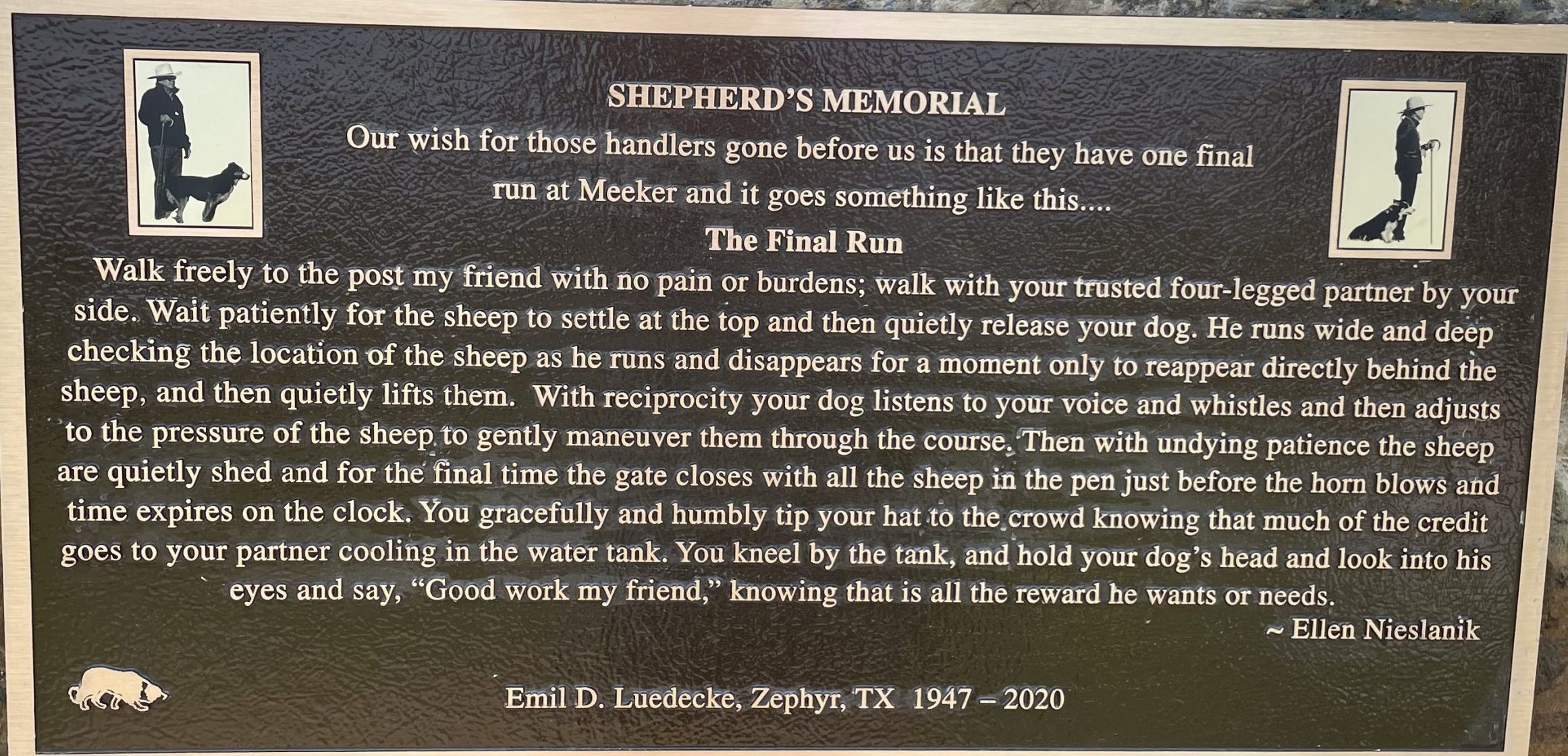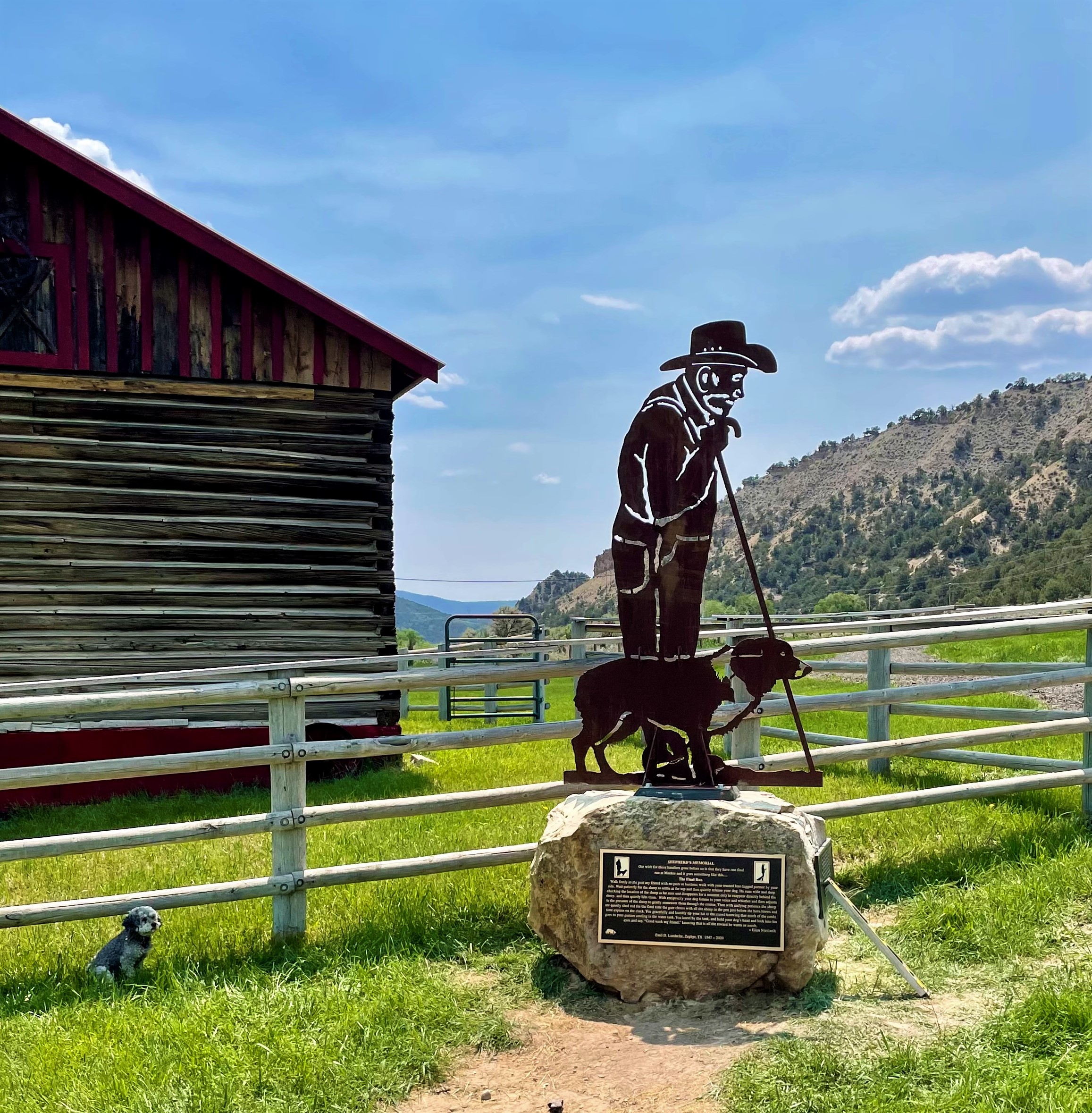 This memorial features a life-size silhouette of a shepherd and his dog mounted atop a native boulder from the area. Tyler Penley, Loveland Colorado –  metal artist and son of handler Nancy Penley created the silhouette. Tyler’s work features a rendering in steel taken from the well known photo of Emil and his dog Zac waiting for their run at the Texas Sheepdog Finals.